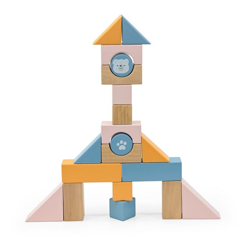 20個の積み木がワゴンに入った木製おもちゃ。
