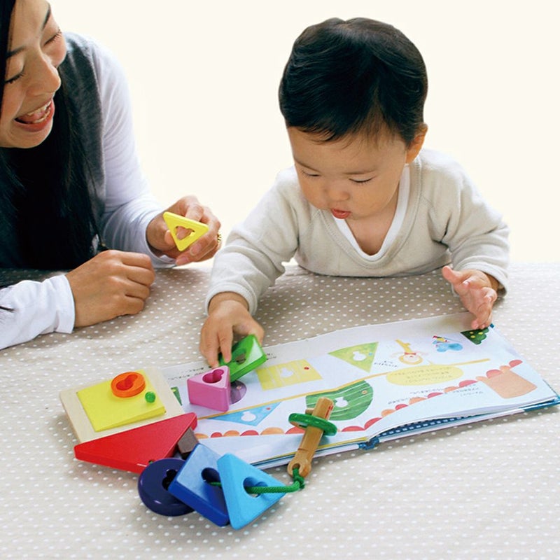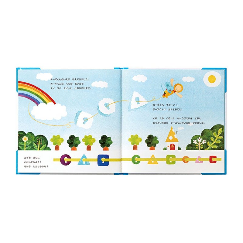 主人公のチーズくんが、いろいろな所に行って色、形、大きさ比べをするお話にそって遊ぶことで、目と手の協調性や指先の発達を促します。