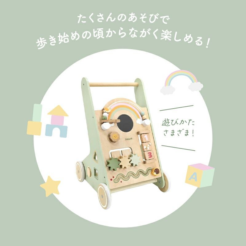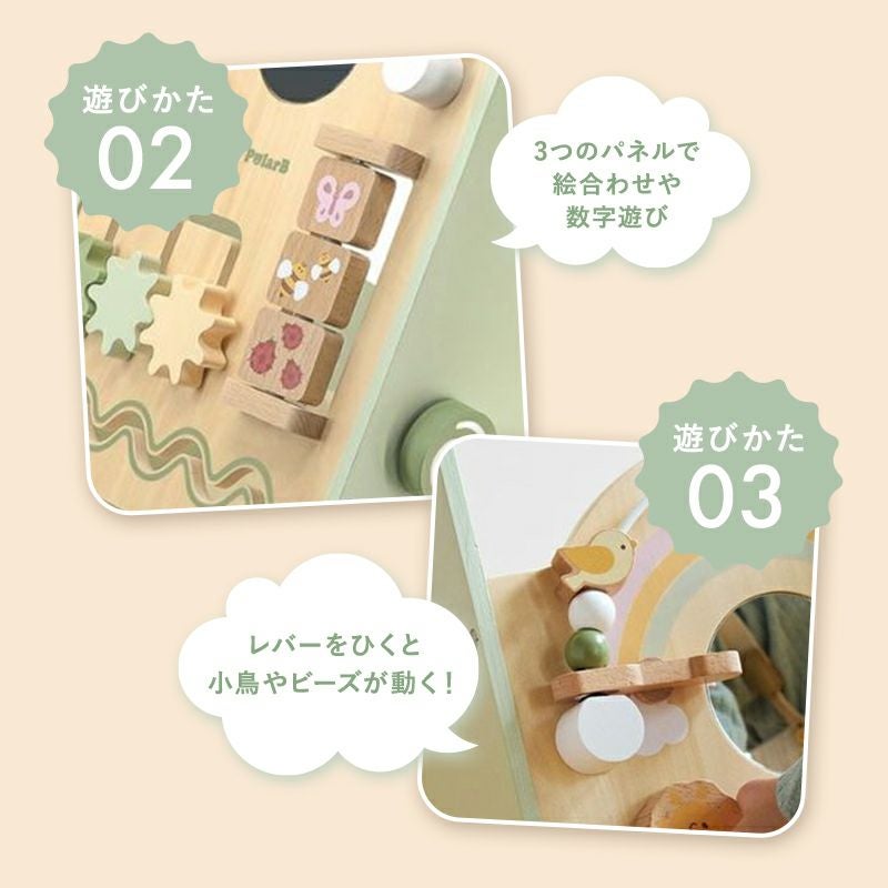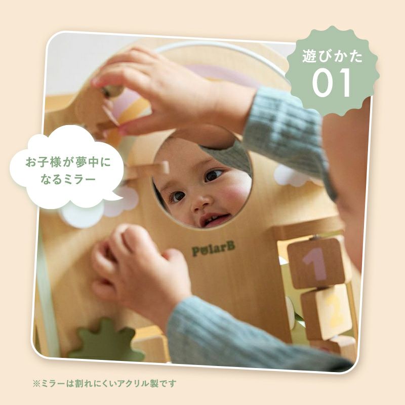 絵合わせ、型はめ、ビーズなどの指先遊びができるしかけや、お子さまが夢中になるミラー付き!
