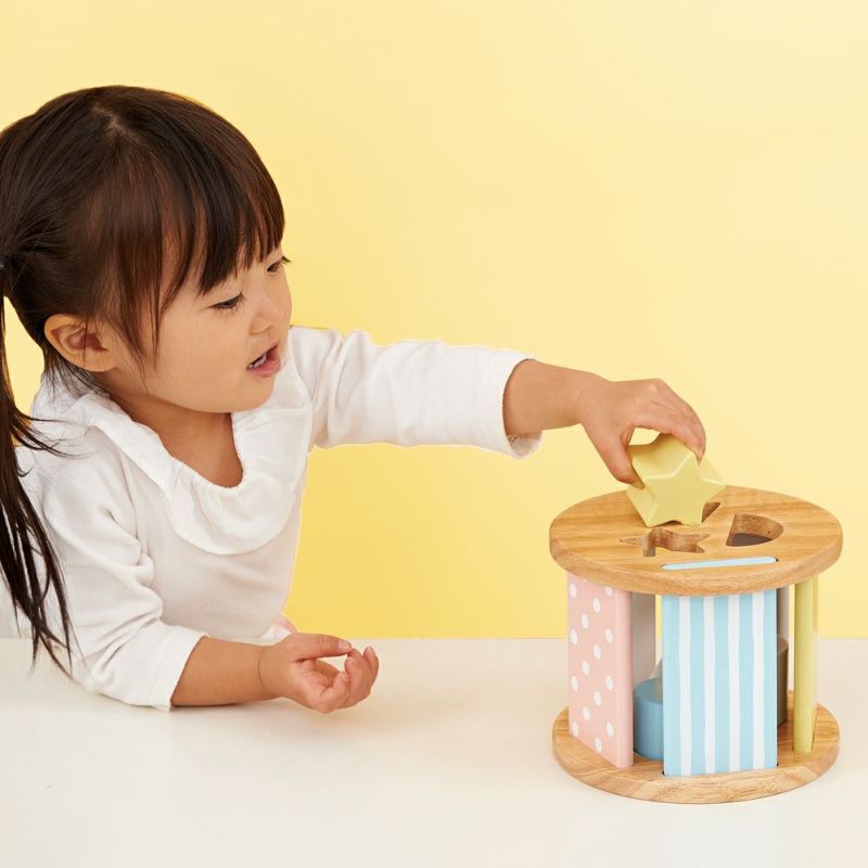 ボックスの穴に合わせて同じ形のブロックを入れる型はめ遊びはもちろん、