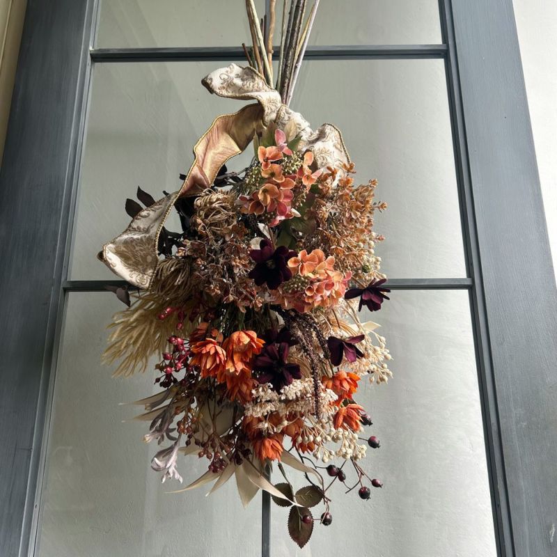 秋色のお花をふんだんに使ったスワッグタイプのアレンジメント。