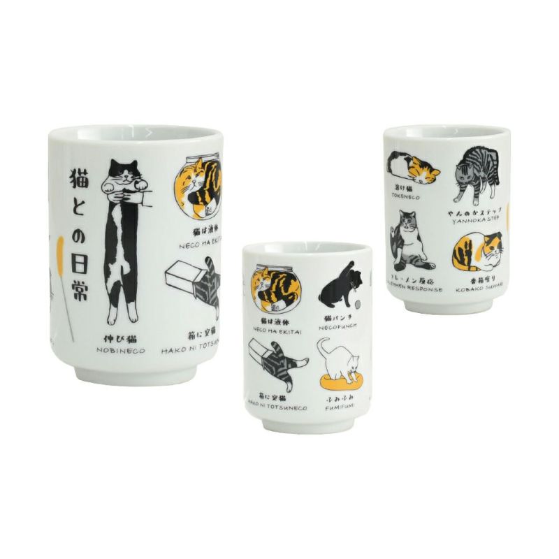 いろんな姿のネコちゃんたちが、ぐるりと1周描かれたユニークなデザインの湯呑です。