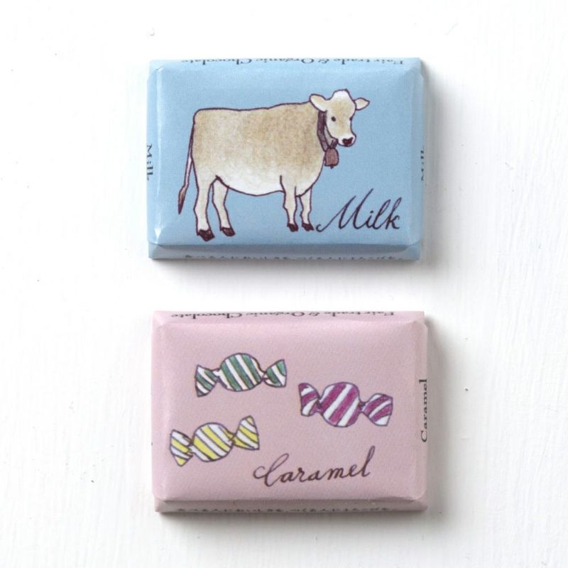 粗糖を使ったミルクチョコと、カリカリのカラメル入りミルクチョコをひとくちサイズでセット。