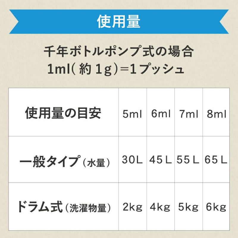 標準使用量:水30L又は洗濯物2㎏に対して5㎖(約5g)/水65L又は洗濯物6㎏に対して8㎖(約8g)