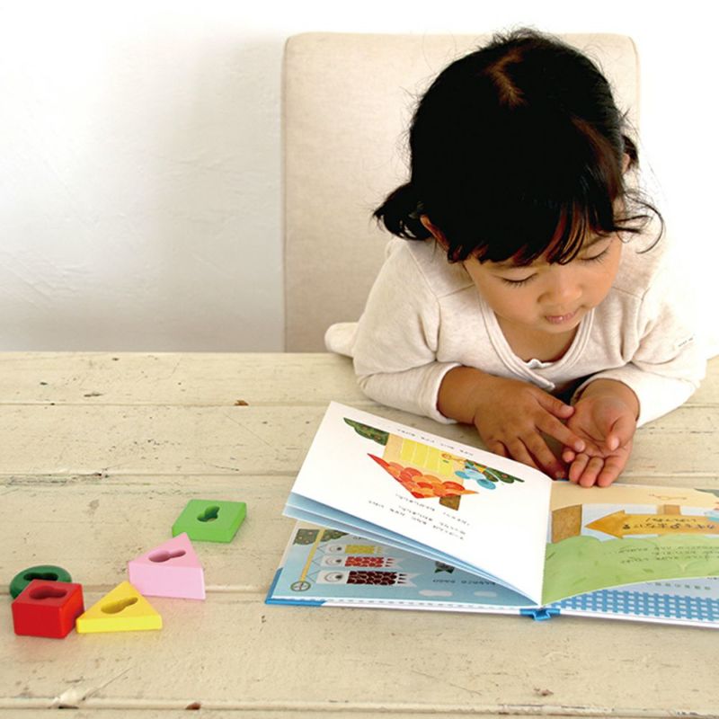 主人公のチーズくんが、いろいろな所に行って色、形、大きさ比べをするお話にそって遊ぶことで、目と手の協調性や指先の発達を促します。