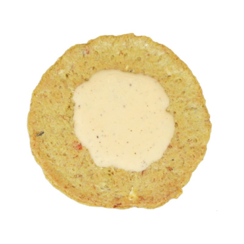 ガーリックとごまで風味付けしたアボカドえびせんべいに、カマンベールチーズを乗せ、洋風で上品な味わいが◎。ほのかな黒こしょうが爽やかなアクセントになっています。
