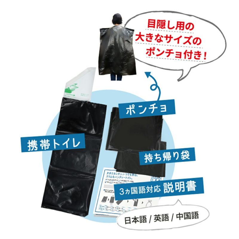 携帯トイレ×1、持ち帰り袋×1、3ヶ国語対応説明書(日本・英語・中国)×1