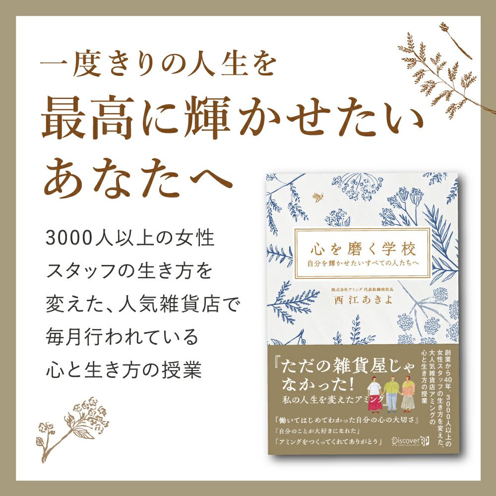 他の画像を見る 返品・交換不可 \2024年5月24日(金)発売 アミングオーナー初著書!/ 『心を磨く学校 自分を輝かせたいすべての人たちへ』 西江あきよ(著) ¥ 1,430 税込 お気に入りに登録する