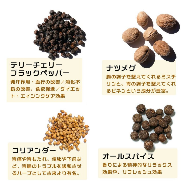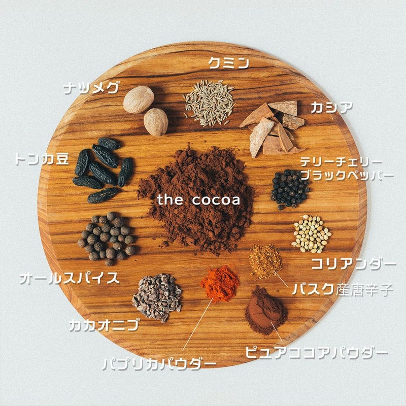 ピュアココア(無添加/無化調)、カカオニブ、トンカ豆、テリーチェリーブラックペッパー、AOP エスプレット唐辛子、ナツメグ、コリアンダー、クミン、オールスパイス、カシア、パプリカ、岩塩