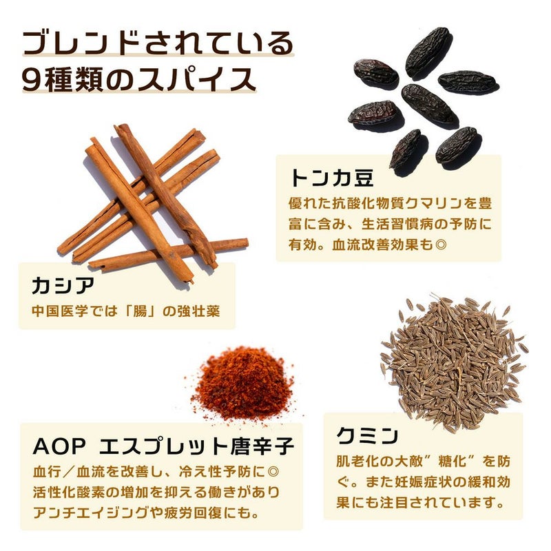 芳醇なカカオ風味を引き立てる9種類のこだわりスパイスと岩塩を加えました。