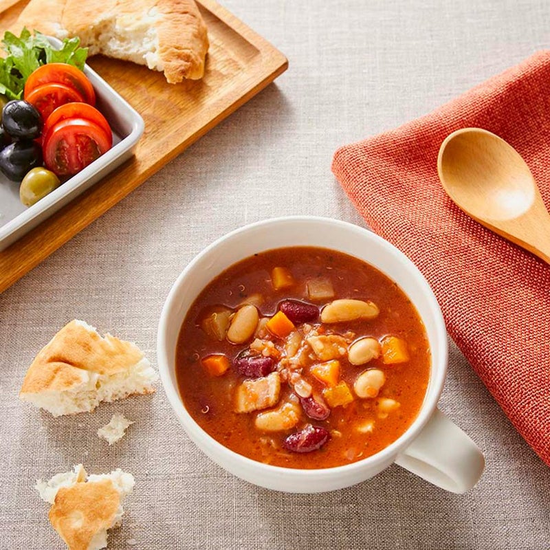 イタリアの家庭料理ミネストローネをお手本に、程よい酸味と穏やかなスパイスの後味が心地よいおいしいスープに仕上げました。