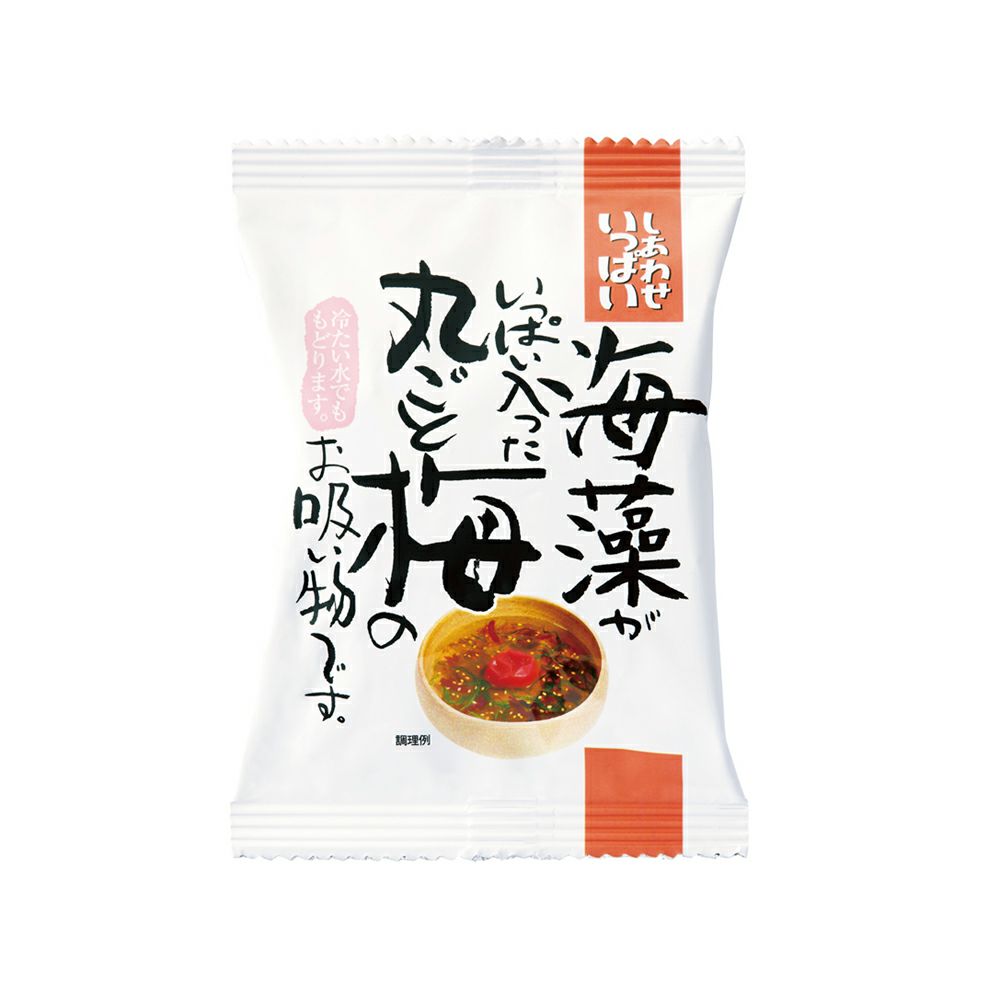 調味梅干(国内製造)、昆布エキス、でん粉分解物、食塩、しょう油(小麦・大豆を含む)、煎りごま、醸造調味料、もみしそ、かつお節エキス、砂糖、乾燥めかぶ、かつお昆布だし、昆布加工品、酵母エキス、ゼラチン、乾燥がごめ昆布、乾燥ふのり、乾燥すぎのり(赤)、寒天、しそ梅酢、梅酢/ 増粘多糖類、酸化防止剤(V.E)