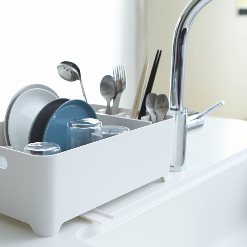 食器についた水は水はけを通って直接シンクへ流れていくので、ぬめりにくく、清潔にお使いいただけます。水はけの向きは調整可能で、ご自宅のキッチンのスペースに合わせて縦横どちらの向きにもレイアウトできるのもうれしいポイント。付属の止水栓を使えば、バスケット内に水をためてつけ置き洗いもできます。