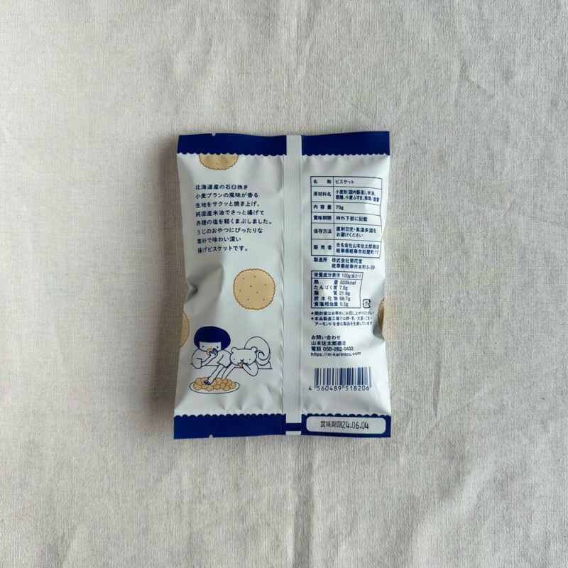 石臼挽き小麦ブランの風味が香る生地をサクッと焼き上げ、純国産の米油でさっと揚げ、ほんのり自然塩をまぶしました。