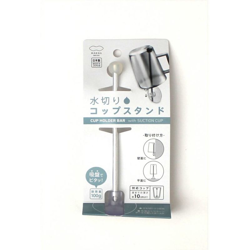 コップの水を切りながら収納できるコップスタンド。壁面や、平面に吸盤でピタッと貼り付けて、スタンドを固定してお使いいただけます。先端のシリコーンボールでコップをやさしくホールド、衛生的に収納できるすぐれものです。