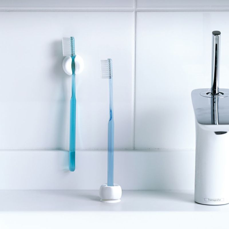 吸盤付きで、壁面フックとしてもスタンドとしても使える歯ブラシホルダー。スペースの限られた洗面所でも使いやすいコンパクトなサイズ感。使っている時も、使っていない時もきれいに映えるシンプルなデザインです。