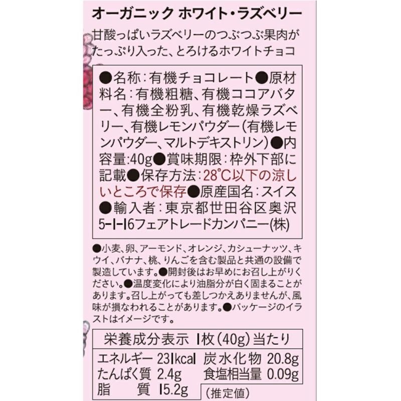 有機粗糖、有機ココアバター、有機全粉乳、有機乾燥ラズベリー、有機レモンパウダー(有機レモンパウダー、マルトデキストリン)