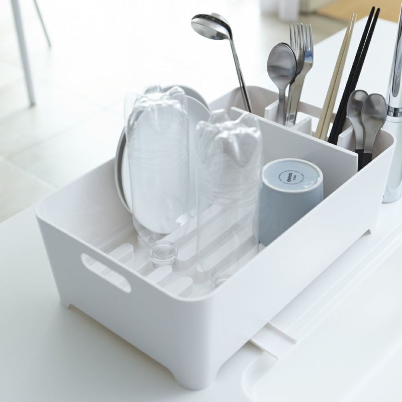よく使う、グラス・カップ・茶碗・カトラリー・調理道具などを収納できるシンプルな水切りバスケット。バスケットの底にスリットが入っているので、お皿を立てて置くことができます。