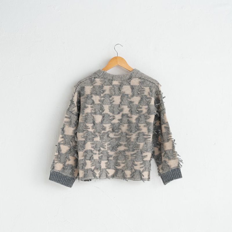 ウールのふんわりとした糸でフリンジを表現しました。ノスタルジックな配色と柄がとてもマッチした1枚で主役になるカーディガンです。