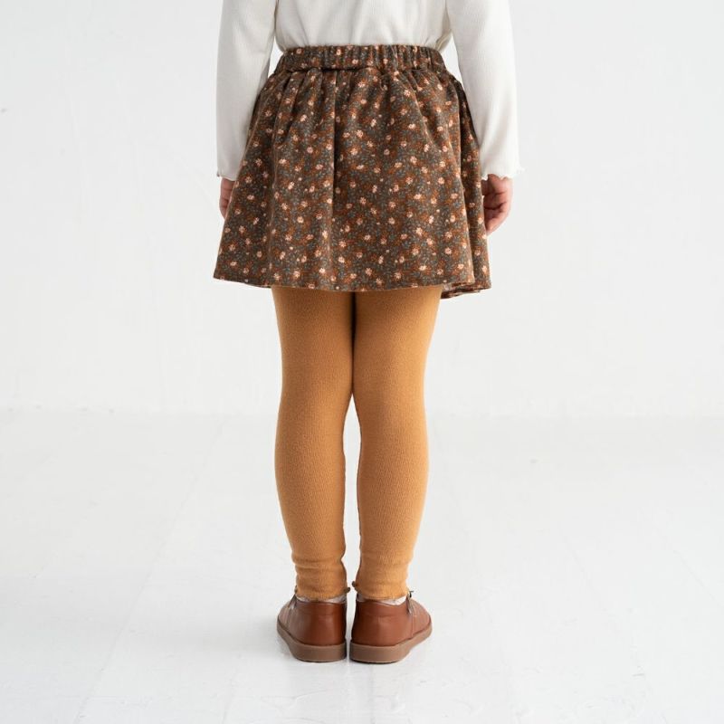 ふわっと広がる起毛花柄スカートにぴったりフィットのリブレギンスをドッキング。動きやすくてあたたかいから元気なキッズにぴったり。キャメルはほっこりナチュラル、チャコールはちょっぴりお姉さん風。秋冬のマストアイテムです♪