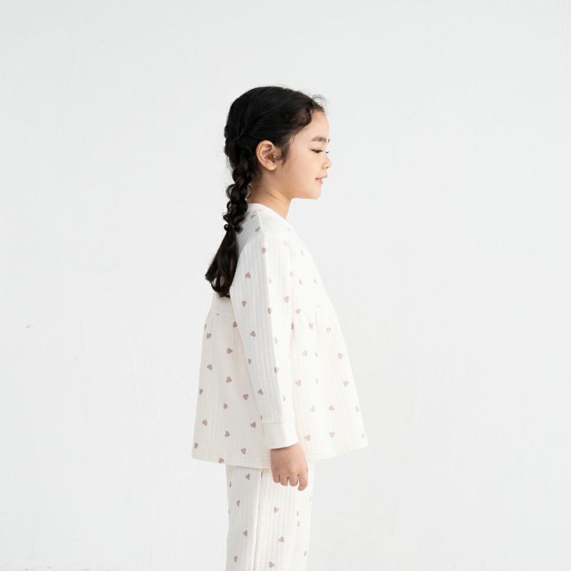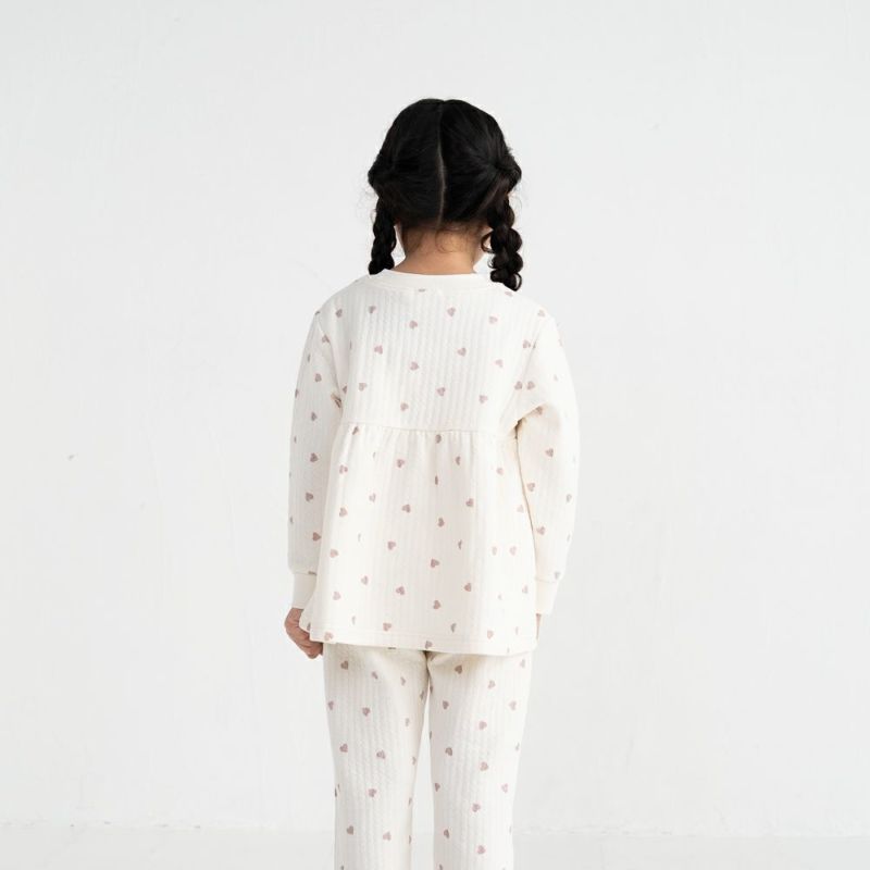 毎日のリラックスタイムに嬉しい小さなハート柄がちりばめられた、ふんわりキルト素材のルームウェアセットです。トップスは胸元で切り替えたギャザーデザインがポイント。ボトムはすっきりとしたストレートシルエットで寝転んでもストレスなし!お泊まり会にも◎