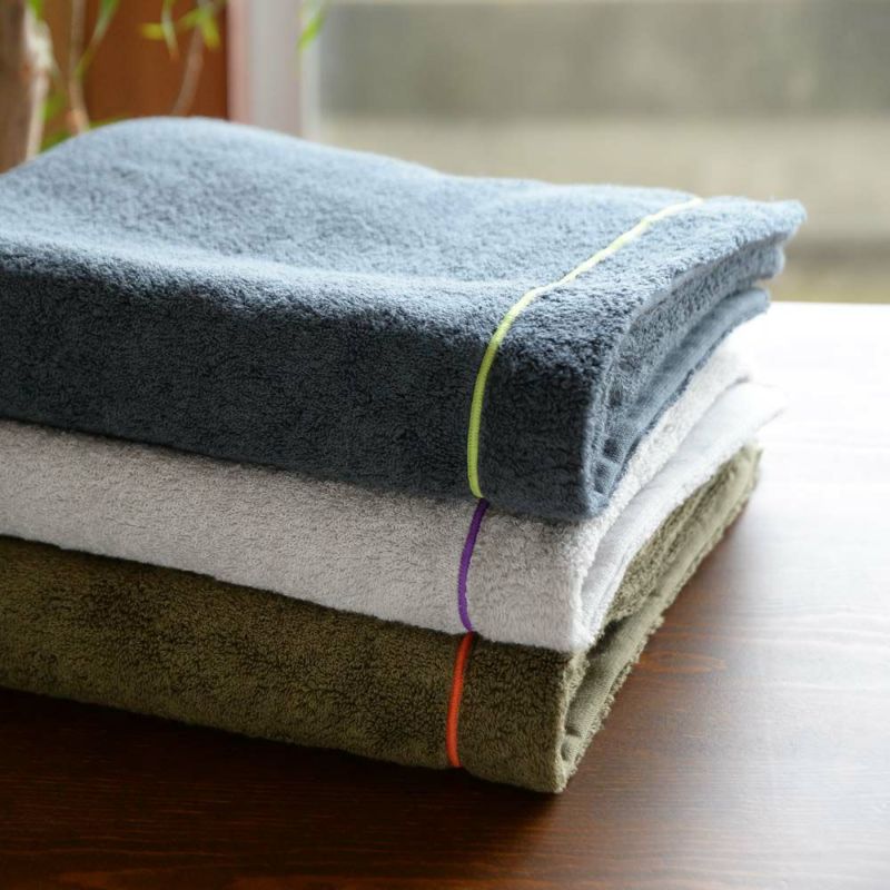 クールなカラーに、いろちがいのメロー巻き縫製でアクセントをつけたかっこよく使えるジェンダーフリーなタオルです。