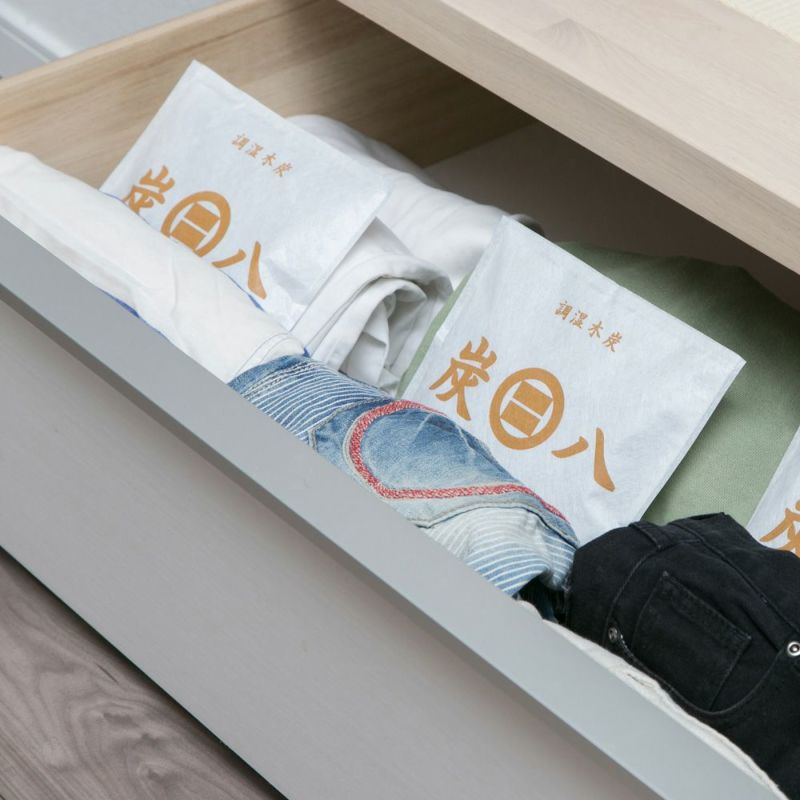 「炭八」は島根県出雲で生まれた調湿用の炭です。湿気の吸湿量、スピードが一般的な備長炭の2倍はあり、お部屋のジメジメや気になるニオイを解決します。室内に置いたり、押入やベッドの下に使用します。
