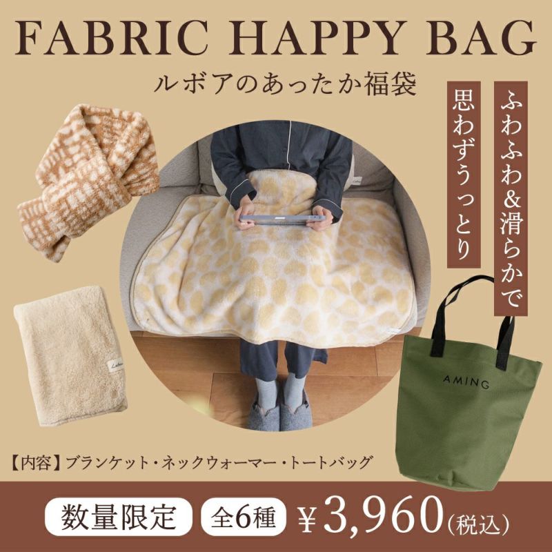 ふわふわで温かいルボア生地のネックウォーマーとブランケット、福袋限定デザインのオリジナルトートバッグ1点を含む、3点セットです。