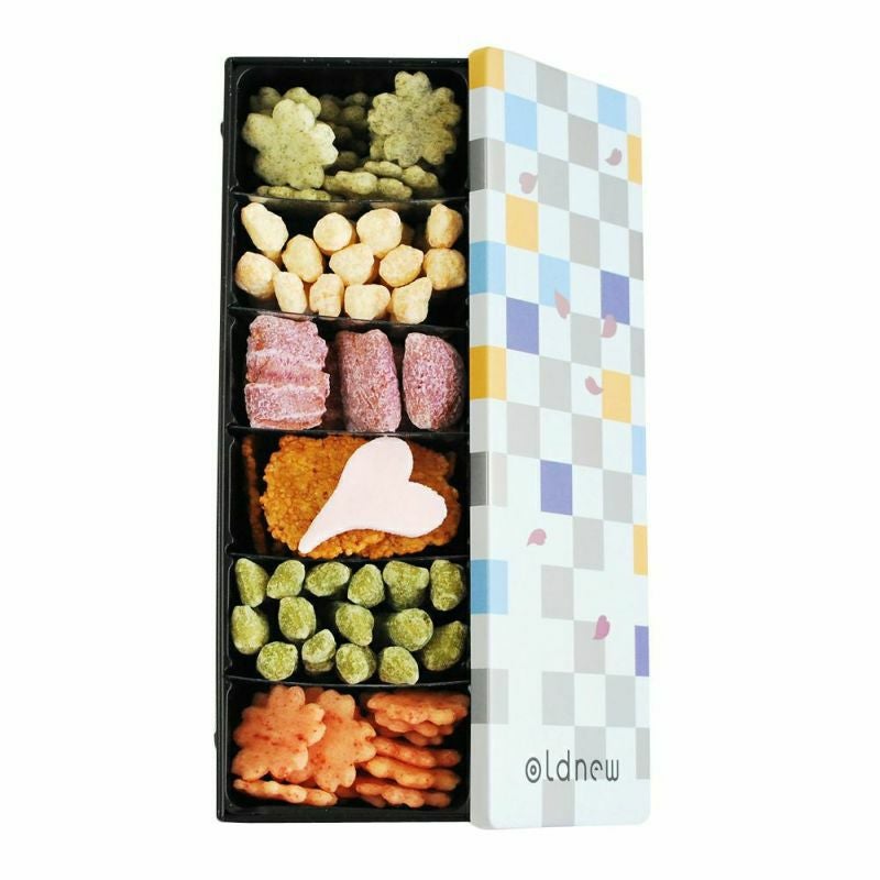 桜小海老あられ・桜青海苔あられ・一口たがね・抹茶あられ・生姜あられ・紫いもあられ・飾り菓子