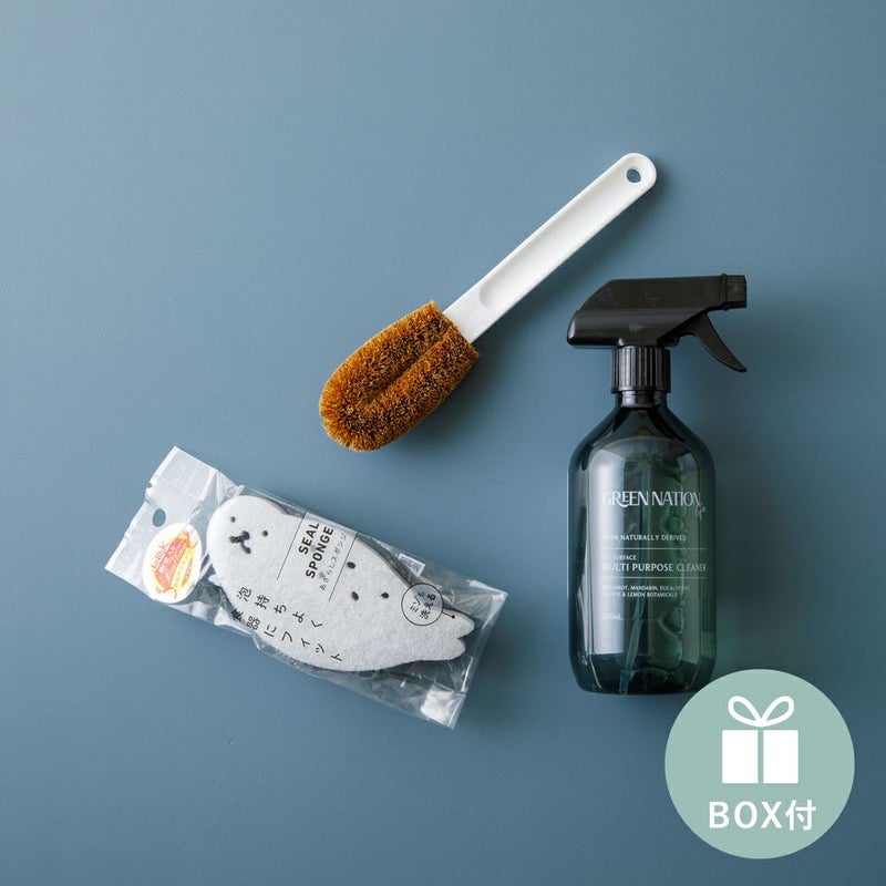 自然の力でしっかり汚れを落とすマルチクリーナーとあざらしの形が愛くるしいスポンジ、しっかりと汚れを落とせる亀の子束子の柄付きたわしのセット。
