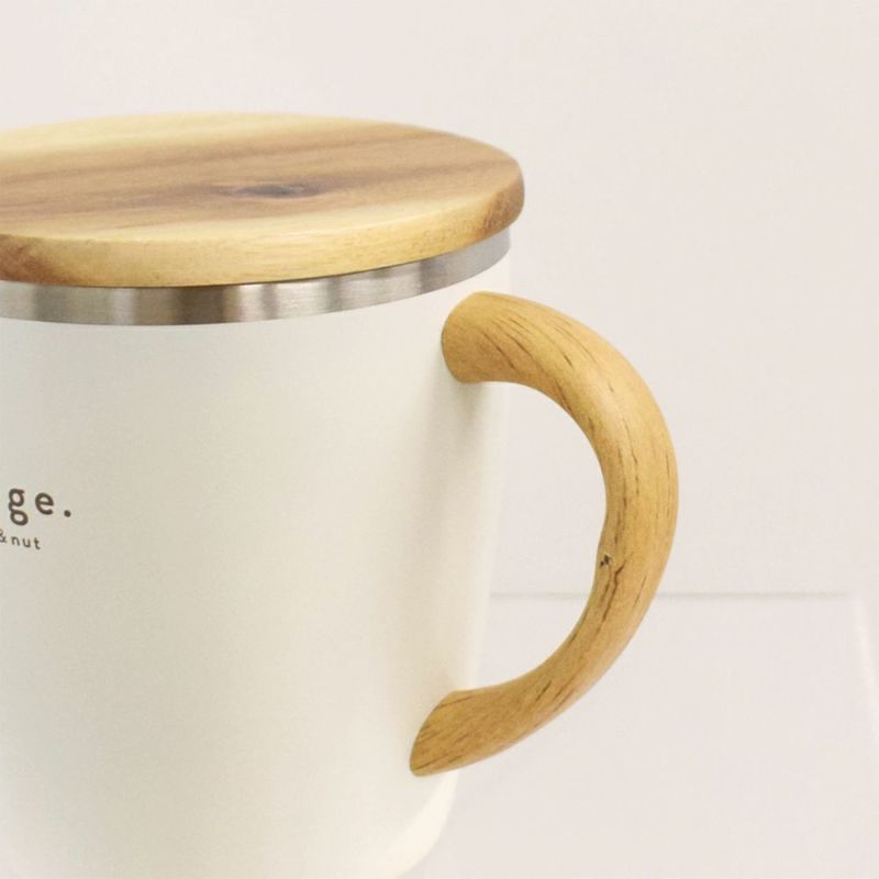 シンプルなグリーンの塗装にワンポイントロゴ、アカシアのフタと木目調の持ち手がおしゃれなマグカップ。