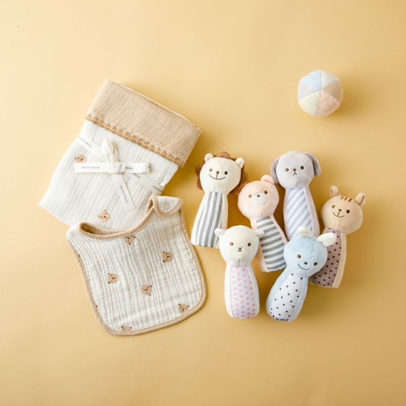 ピンやボールに鈴が入っていて、転がしたり振ったりするとやさしく軽やかな音がなる布おもちゃと、綿100%でガーゼ生地に小さめの刺繍がとびきり可愛いおくるみ&スタイのギフトセット。