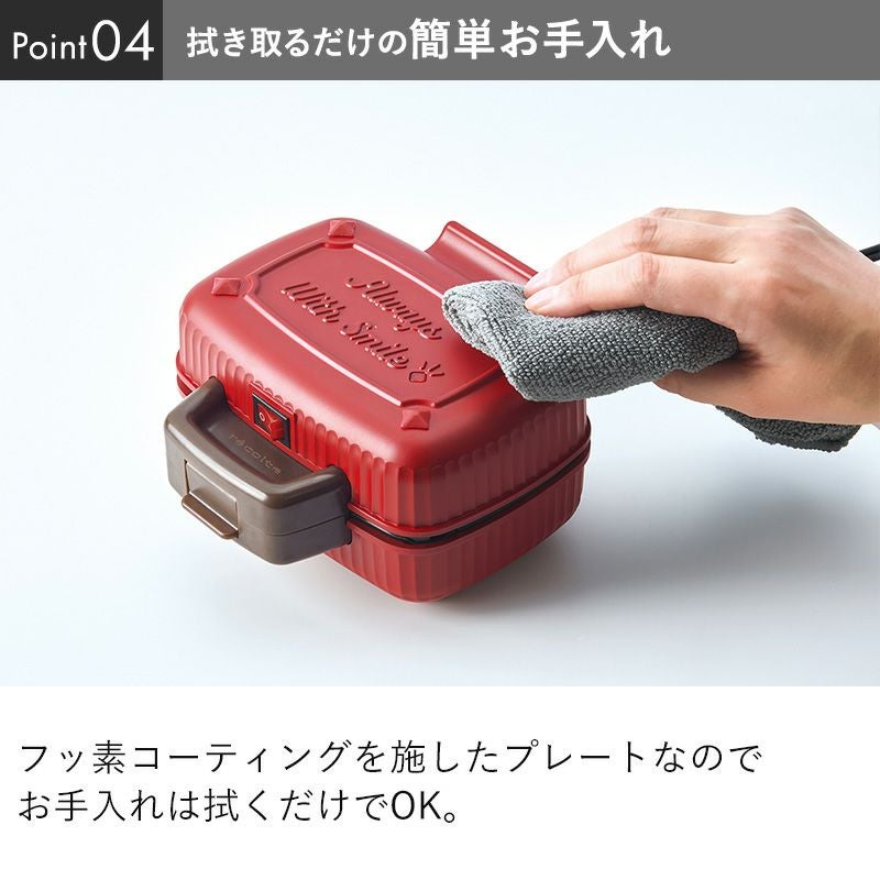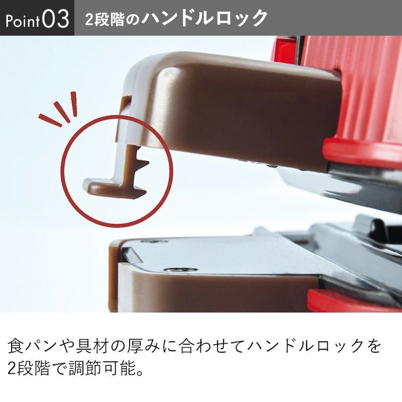 厚みのある食パンも耳までしっかり閉じられる2段階のハンドルロック、上下の深さが違うプレート形状など、キレイに焼ける工夫もうれしいポイント◎