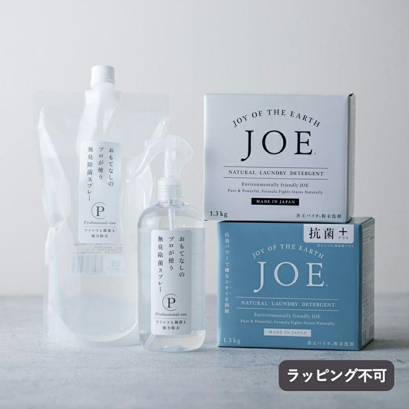 低刺激で人にやさしい、理想の除菌スプレーと洗濯物のお悩みにおすすめの抗菌洗剤「JOE」のギフト。