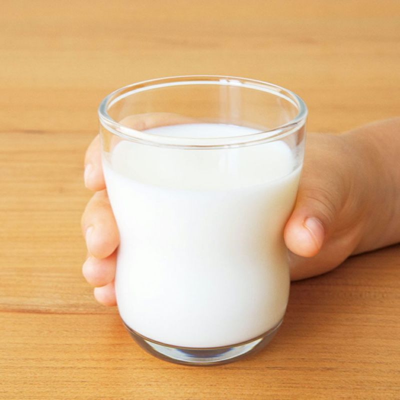 小さな手でも持ちやすい形状の、日本製のガラスコップ。8分目くらいまで注いだ時の容量はおよそ100mLで、2歳~3歳頃のお子さまにおすすめです。