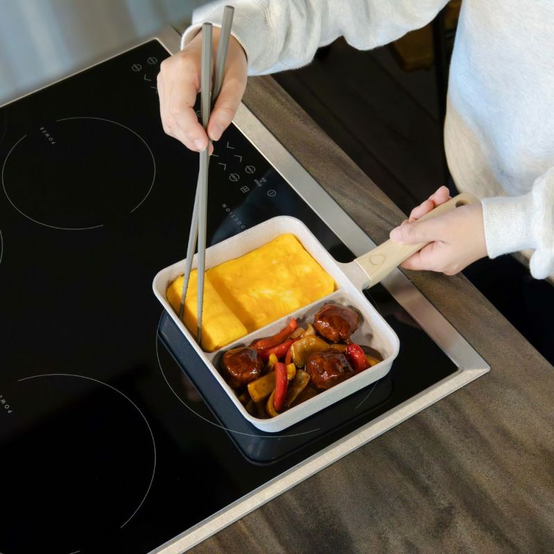 仕切り付きなので卵焼きや焼き鮭、ウインナーなど2品同時に調理出来るので時短になり、