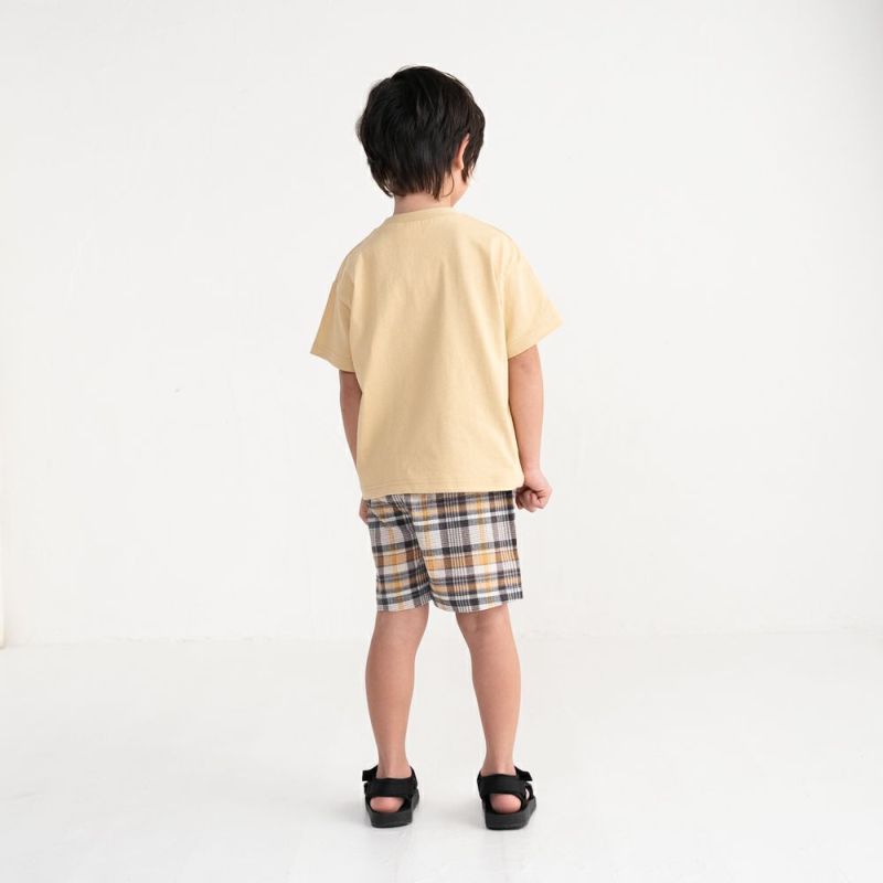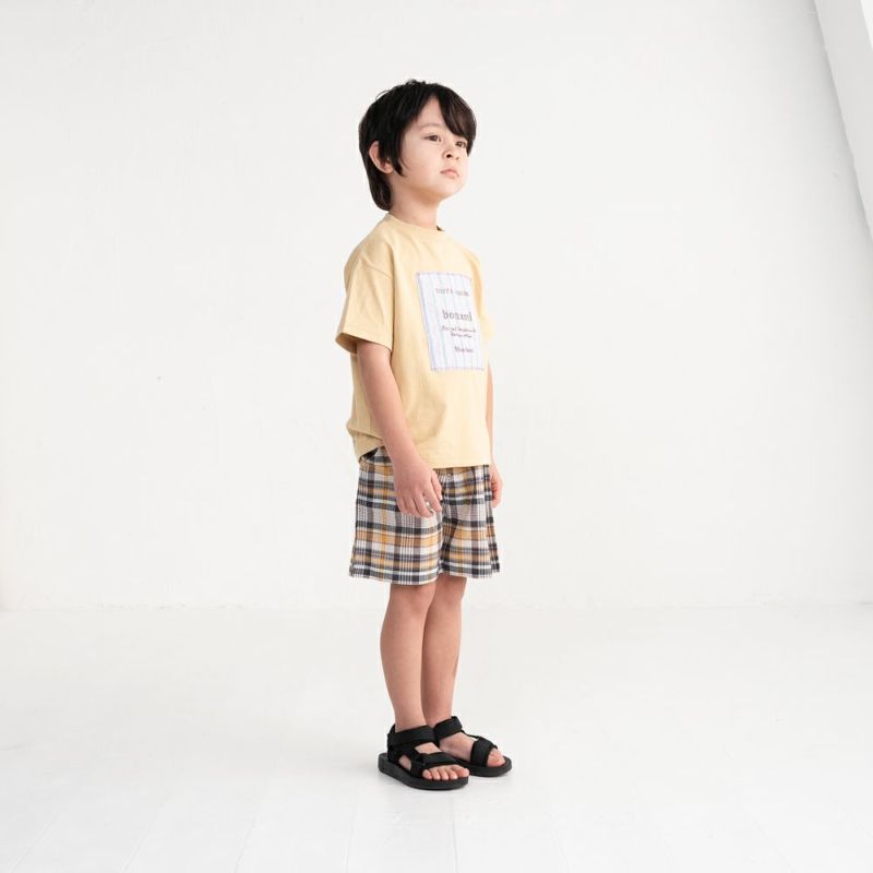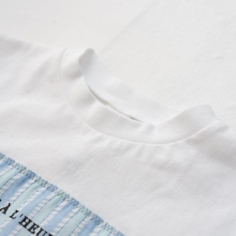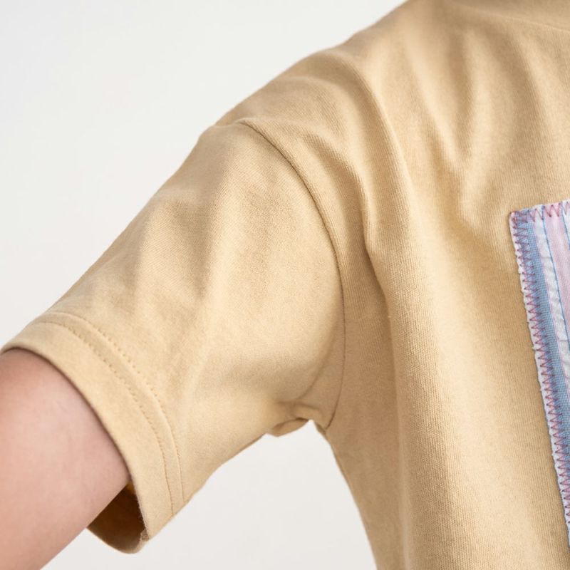 サッカー生地ならではの軽やかな表情が爽やかなアップリケ×英字プリントの5分袖Tシャツ。
