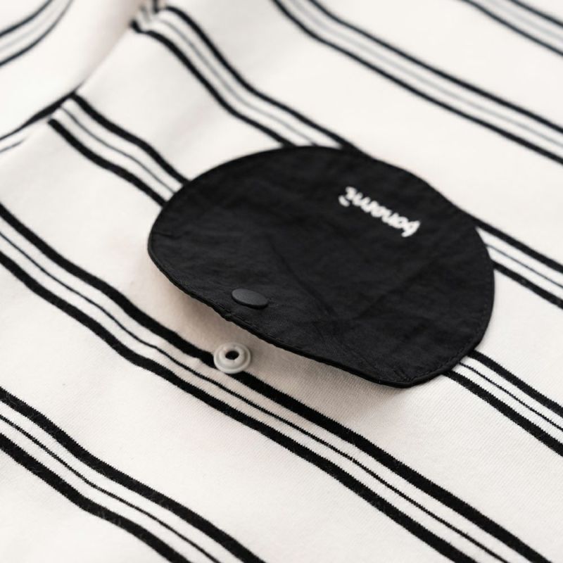 胸元には丸デザインが可愛いポケットをオン。異素材ポケットがアクセントに。小さな刺繍でさりげないおしゃれ感をプラスしました。