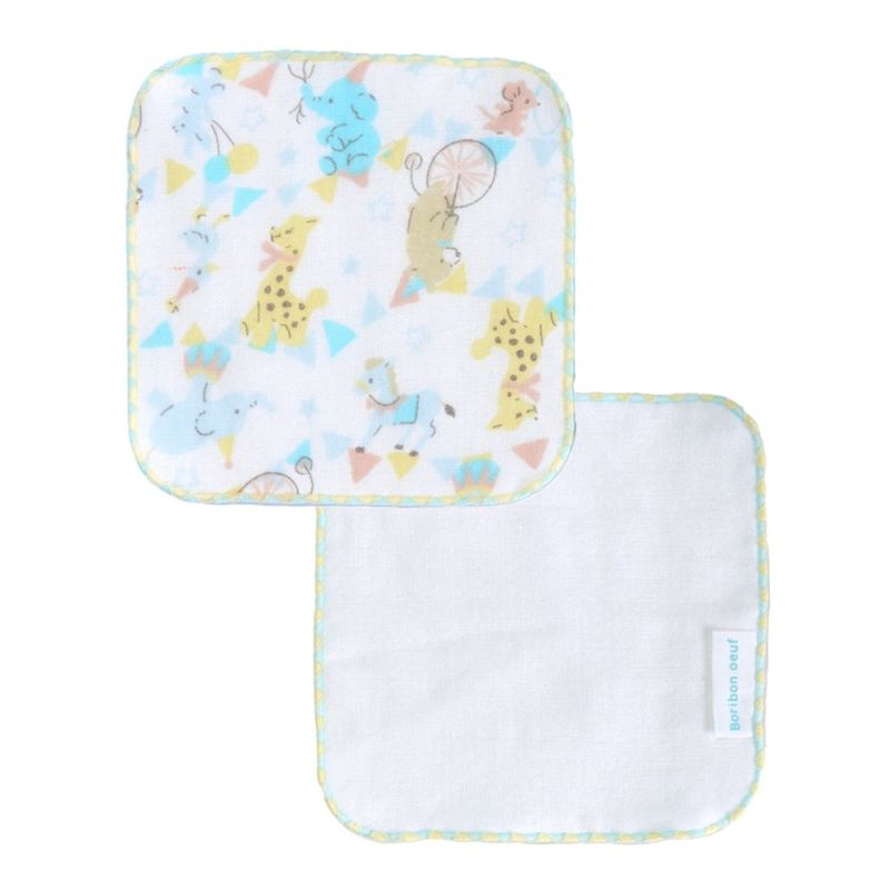 淡いパステルカラーのサーカス柄、スィルクシリーズ。大人の手のひらサイズのミニサイズのハンカチの2枚セット(プリント×ムジ)。小さな子供の手にも使いやすく、また、お子様のお洋服のポケットにも入れやすいサイズです。表ガーゼ裏ムネン糸パイル生地を使い、吸水性も良くふんわり柔らかな使い心地です。