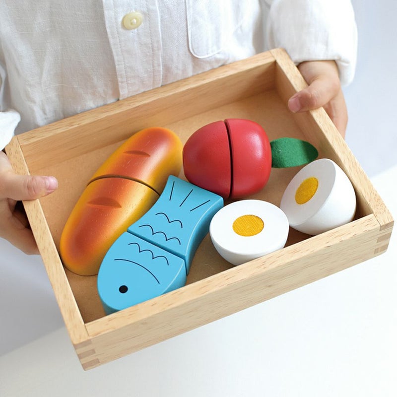 持ち運びしやすいサイズの木箱は、収納はもちろん、トレイに見立ててレストランごっこ、マルシェ風の箱にしてお店屋さんごっこ、ひっくり返してテーブルとして使ったり、遊びの幅がぐんと広がるアイテム♪