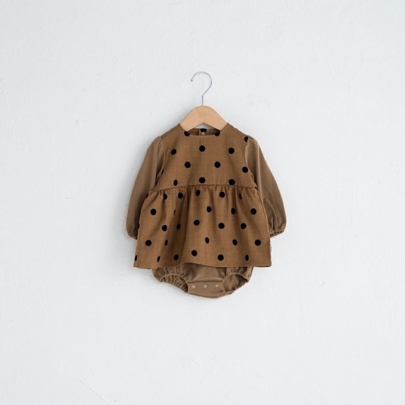 秋のお出かけにぴったりなふんわり可愛いベビーロンパース。ハイウエストの切り替えデザインとギャザースカートデザインで愛らしく、フロッキードットで上品に仕上げました。ぷっくり袖とブルマ部分にはカットソーを採用。ギフトにもおすすめです。