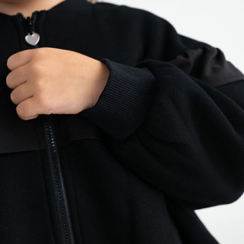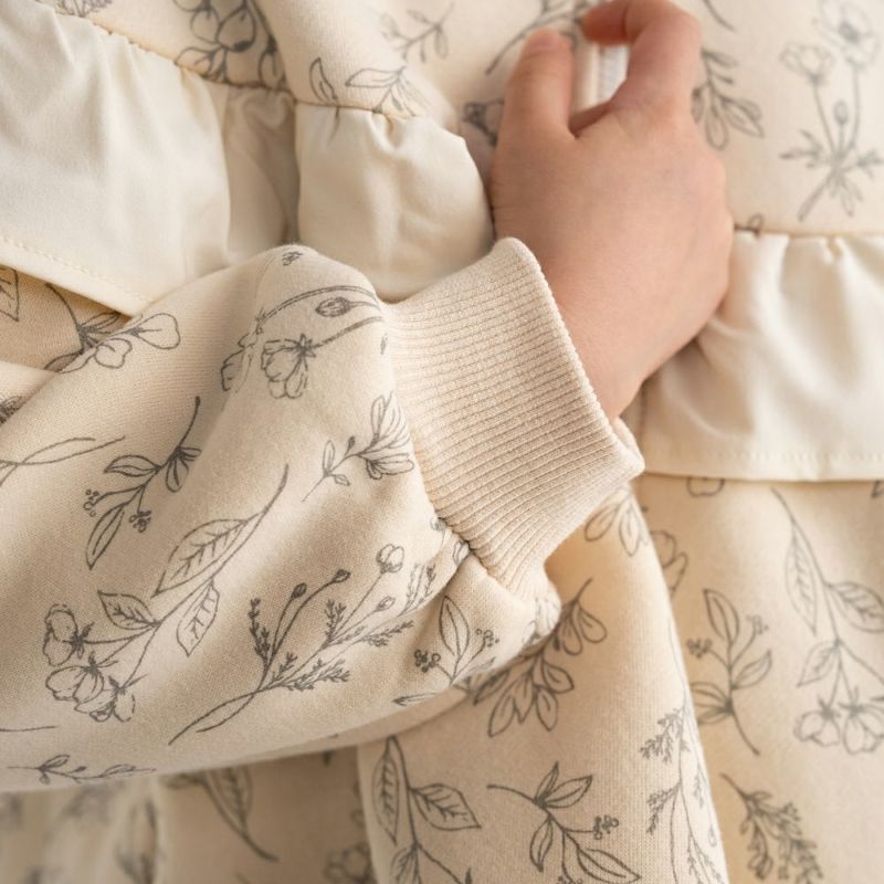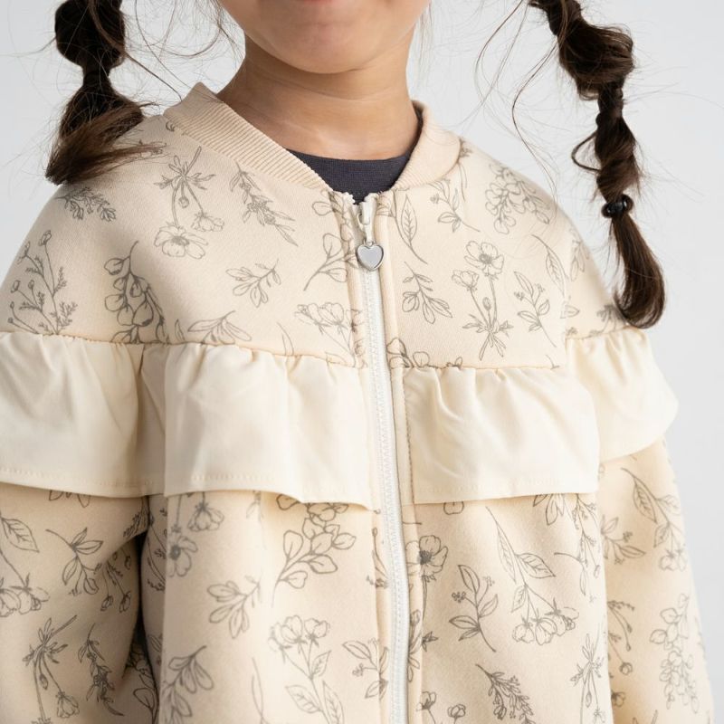 ラウンドヨークにあしらった異素材フリルがさりげなく女の子らしさを演出。裏毛起毛素材であたたかく、袖ロはリブ仕様で風を通しにくいのも嬉しいポイント。通園通学やお出かけにびったりな、デザイン性と機能性を両立した1着です。