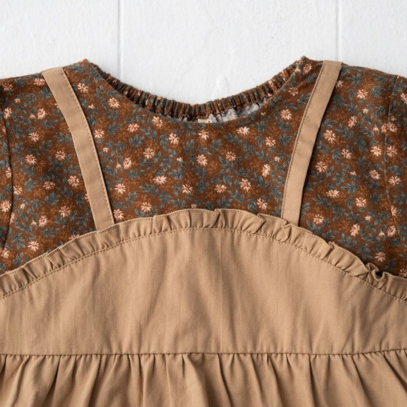 あたたかみのある起毛花柄ブラウスとフリルジャンスカを組み合わせたガーリーなドッキングデザイン。後ろ衿ぐりはゴム仕様で着脱もスムーズ。可愛さと機能性を1枚にぎゅっと詰めこみました♪お出かけやお呼ばれにもぴったりのワンピースです。