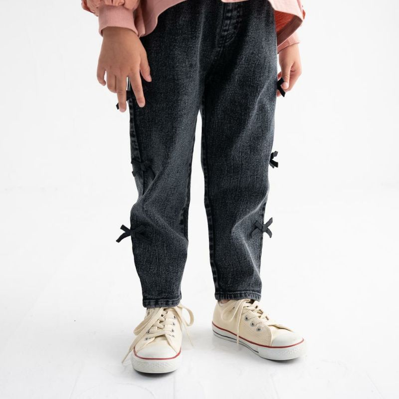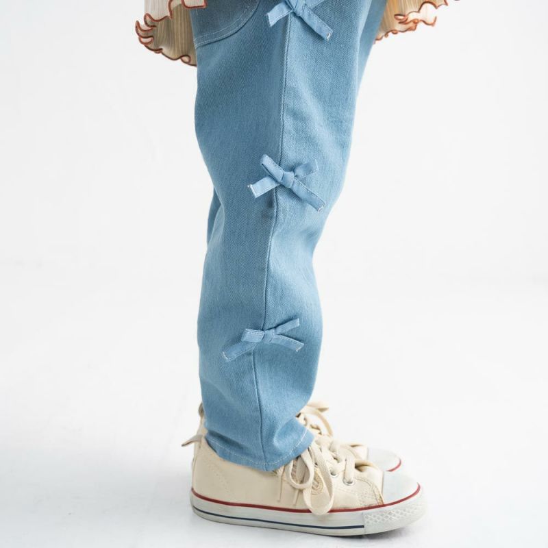 可愛いと着やすいのちょうどいいバランスが1本で叶うよくばりリボンデニム♪ラフな穿き心地はそのままにサイドにあしらったリボンでほんのりフェミニンに。ゆるやかなテーパードシルエットが体型を選ばず、デイリーに活躍します。