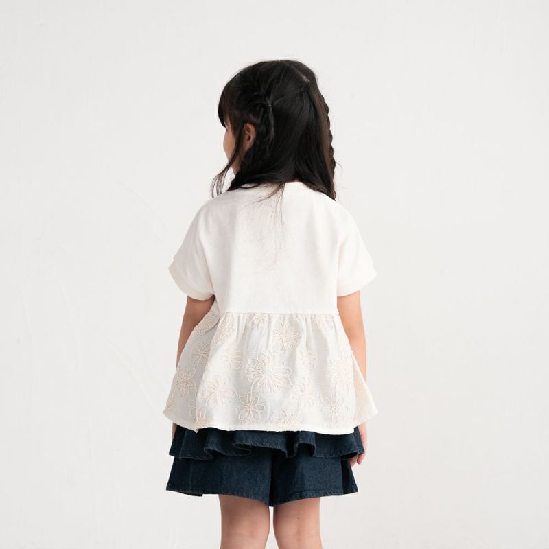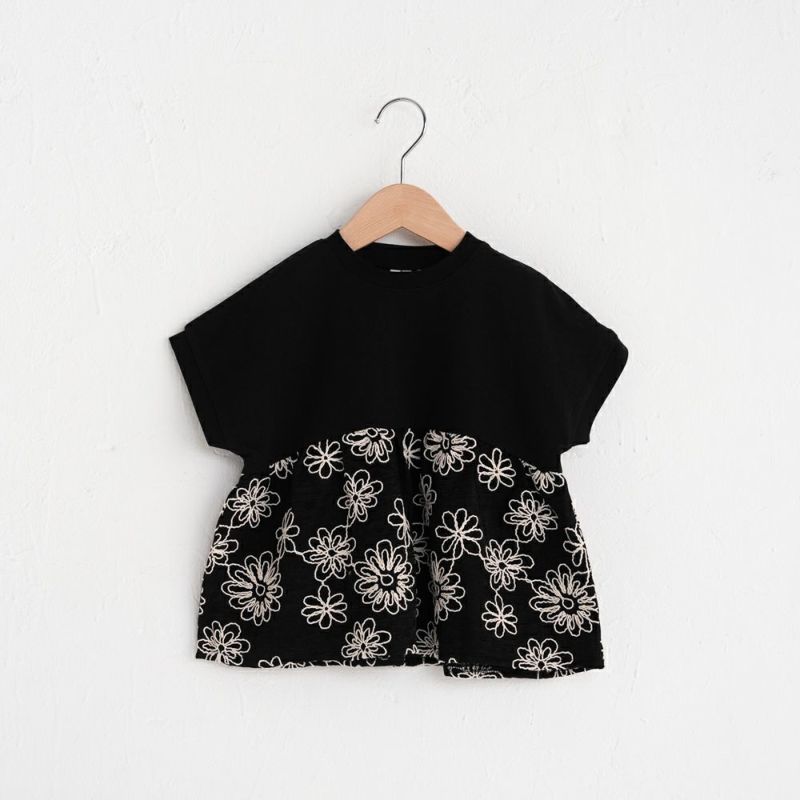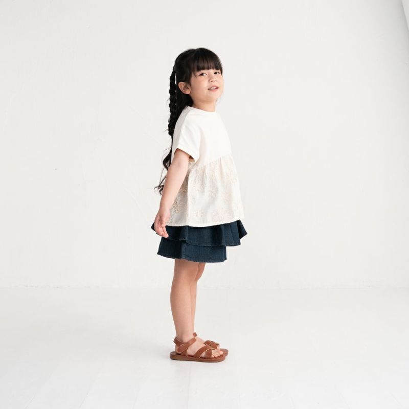 コード刺繍が新しい軽やかなフリルTシャツです。お花模様の華やかさを際立たせるのはシンプルに仕上げたヨーク。カットソー素材を採用し着やすさと動きやすさにも考慮しました。動くたびにふんわり揺れるフリルが女の子らしさを引き立てます。