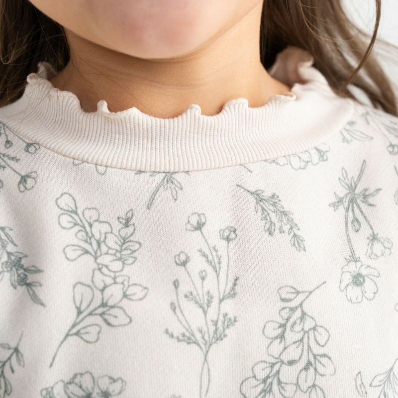 実用性の高いトレーナーワンピースにボタニカル花柄をあしらい、デイリーに使いたいワンピースが完成!お顔周りと袖口はメローフリルで飾って愛らしい装いに。裏毛起毛なので1枚であったか♡前後差のある技ありへムが抜け感を演出!