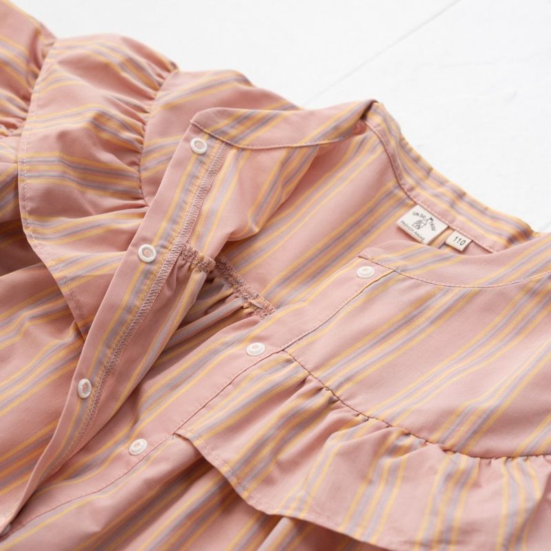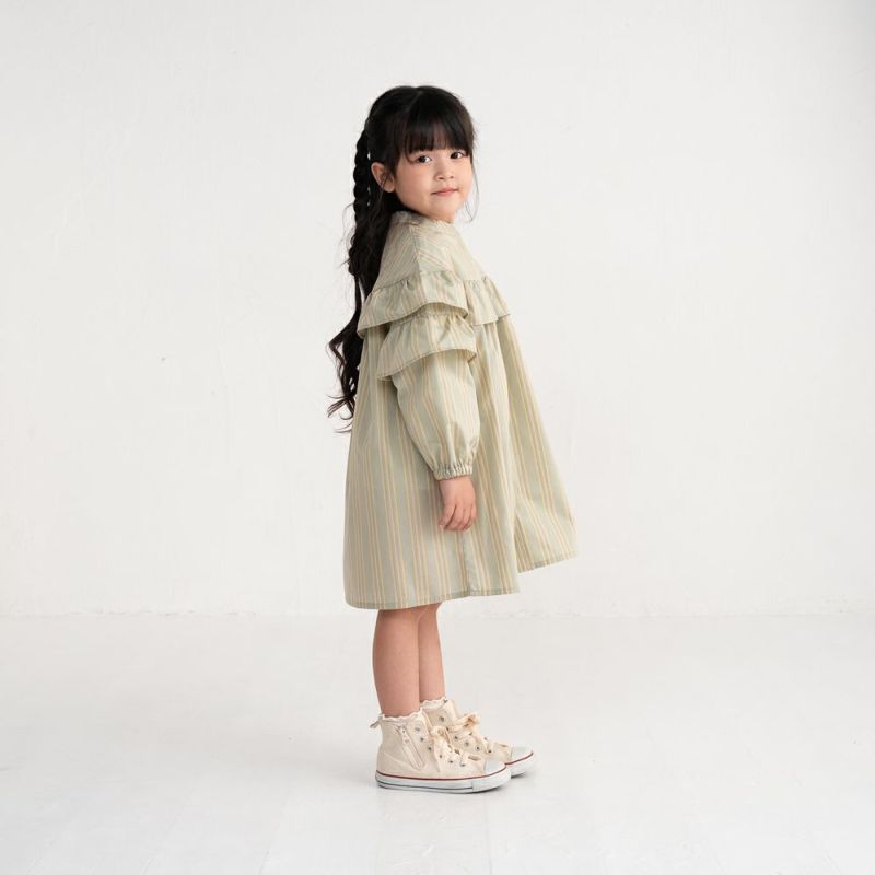 ドロップショルダーで抜け感を感じるデザインフリルワンピース♪ギャザーたっぷりのフリルデザインがガーリーな印象ながらもストライプ生地を採用することで清楚な大人っぽさとの両立を実現。袖口ゴム、前あきスナップで実用性も◎