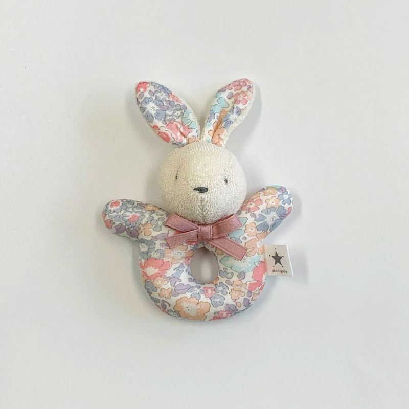 リバティ柄がとってもキュートなスタイとラトルはシンプルなお洋服にも相性ぴったり!