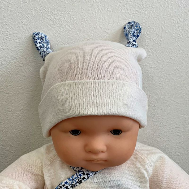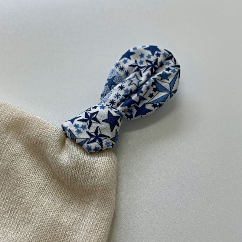 育児工房の製品は、綿花を糸に紡ぐところから縫製まで、すべて日本国内で行われています。赤ちゃんの肌に直接ふれるものだから、素材にこだわったものを選びたいですよね。角の結び目がアクセントになったかわいいデザインです。