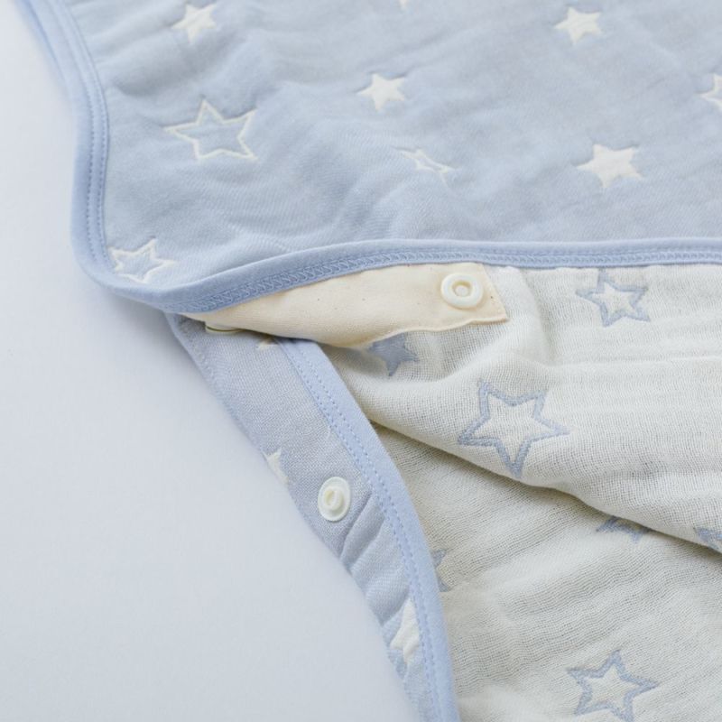 左肩と両脇をスナップで留めるタイプなので、眠ってしまった赤ちゃんに着せてあげるのも簡単です。寒い冬の夜だけでなく、夏の冷房対策としてやお昼寝の時などにも使える便利なアイテムです。オリジナルデザインの星柄は、ピンクとブルーの2種類。丁寧に作られた日本製で、大切な方への贈り物にもおススメです。